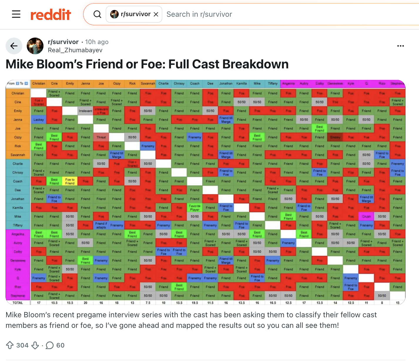 The interviewer leading these episodes is Mike Bloom, and for each person he does a game of “Friend or Foe,” having them run down whether or not they want to work with every single other player who is also on the cast. These conversations have produced incredible content – but most importantly for me, incredibledata. I immediately wanted to cross-compare interviews. Sure Aubrey doesn’t want to work with Q…but what does Q think? Ozzy wants to work with Cirie…but how many options does Cirie have?